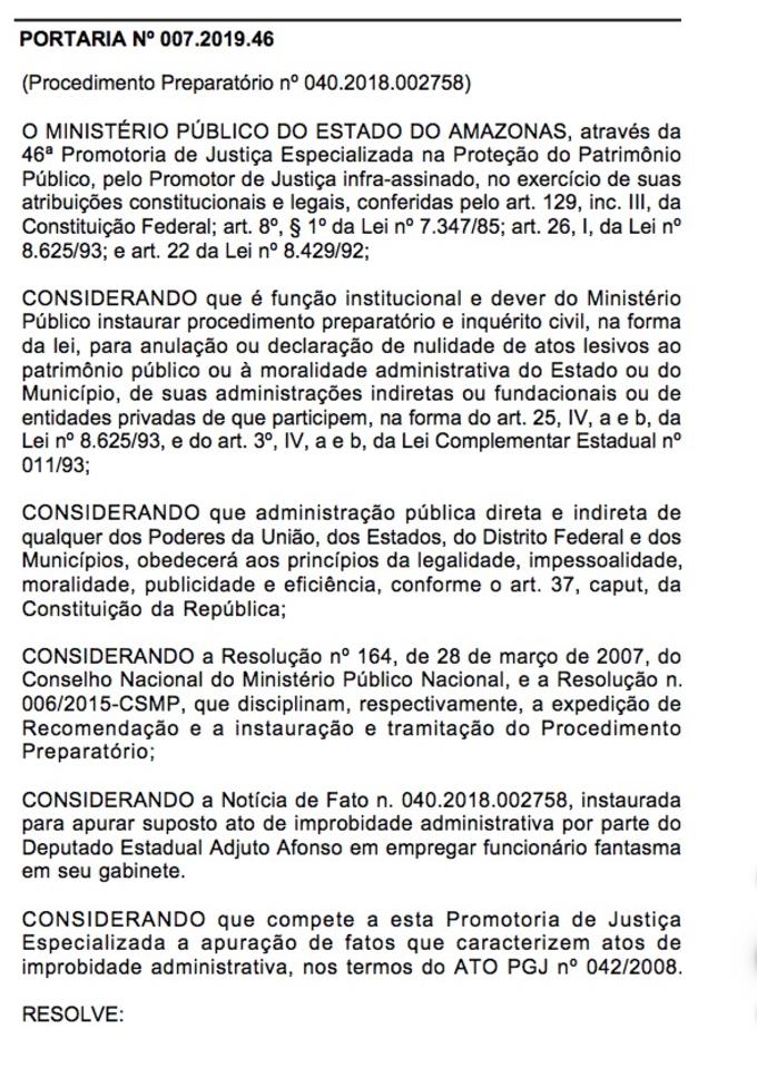 Manaus/AM - O deputado estadual Adjuto Afonso (PDT) está sendo alvo de investigação do Ministério Público do Estado do Amazonas (MP-AM) por supostamente empregar funcionário fantasma em seu gabinete na Assembleia Legislativa do Estado do Amazonas (Aleam). O suposto crime configura em ato de improbidade administrativa, conforme decisão da promotora Sheyla Frota.
