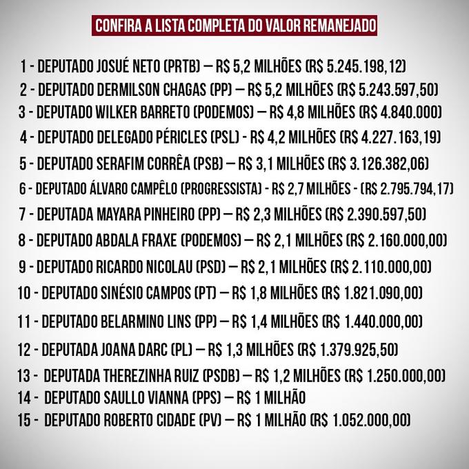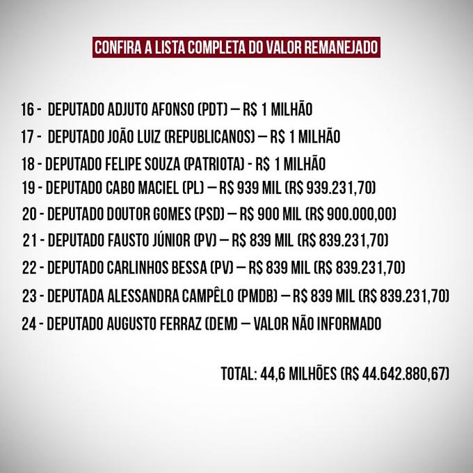 Veja a tabela com quanto cada deputado destinou:
