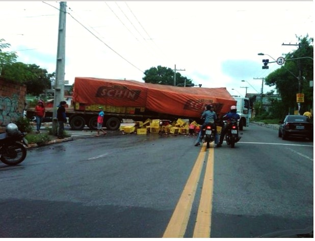 Manaus/AM - Duas carretas transportando cerveja da marca Schin tombaram há pouco em locais diferentes da cidade, deixando vasilhames pelas pistas nas zonas Sul e Norte.
