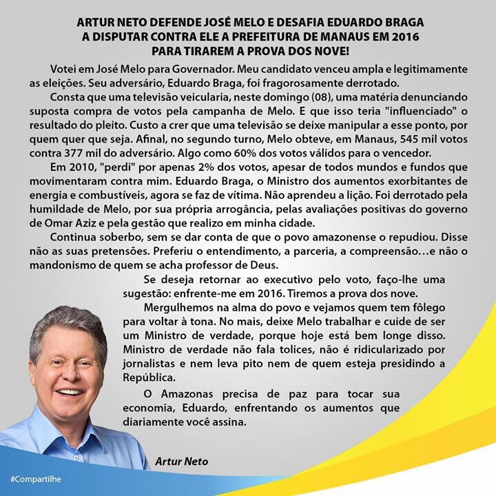 DESAFIO: Artur desafia Eduardo Braga a disputar prefeitura contra ele em 2016