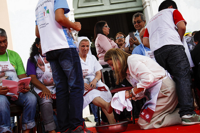 Usando um avental, a presidente do TJAM participou de rito religioso lavando pés da Irmã Ana Pedroso Monteiro, Franciscana Missionária de Maria.