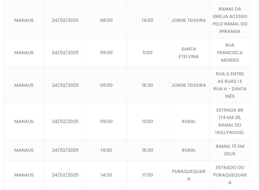 Manaus/AM- Oito bairros e três ramais da BR-174 e AM-010 ficarão sem energia nesta segunda-feira (24).