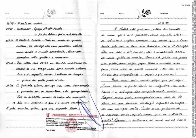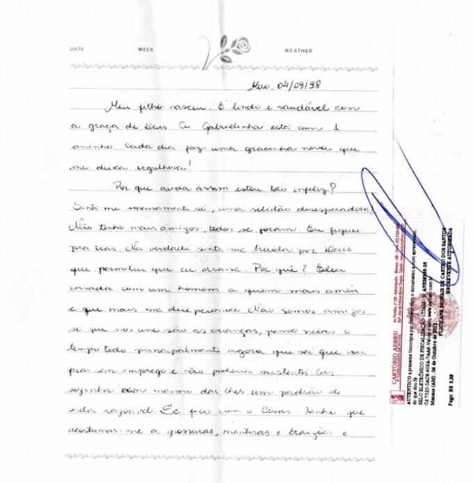 Nesta semana, começaram a circular fotos do diário que era da perita assassinada. Nele, constam detalhes de como era o dia-a-dia de Lorena. Com muitos detalhes sobre seus dois filhos, a vida da perita não era só flores, em textos tocantes, ela relata casos de traições e agressões que sofreu durante o casamento com o dentista Milton César Freire da Silva, acusado de matá-la; confira: