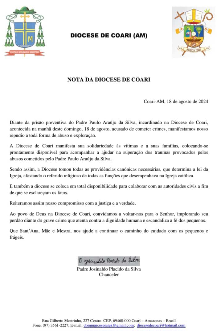 Manaus/AM - A Diocese de Coari se manifestou, neste domingo (18), após a prisão do Padre Paulo Araújo por filmar, armazenar e manter relações sexuais com adolescentes, no município, no interior do Amazonas.