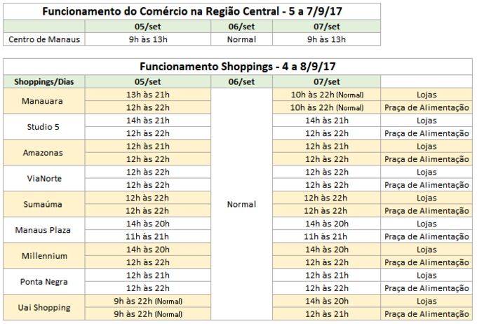 Manaus/AM - A Fecomércio informou nesta sexta-feira (1º) o horário de funcionamento do comércio nos feriados dos dias 5 e 7 de setembro em que comemora-se a Elevação do Amazonas à Categoria de Província e Independência do Brasil, respectivamente.