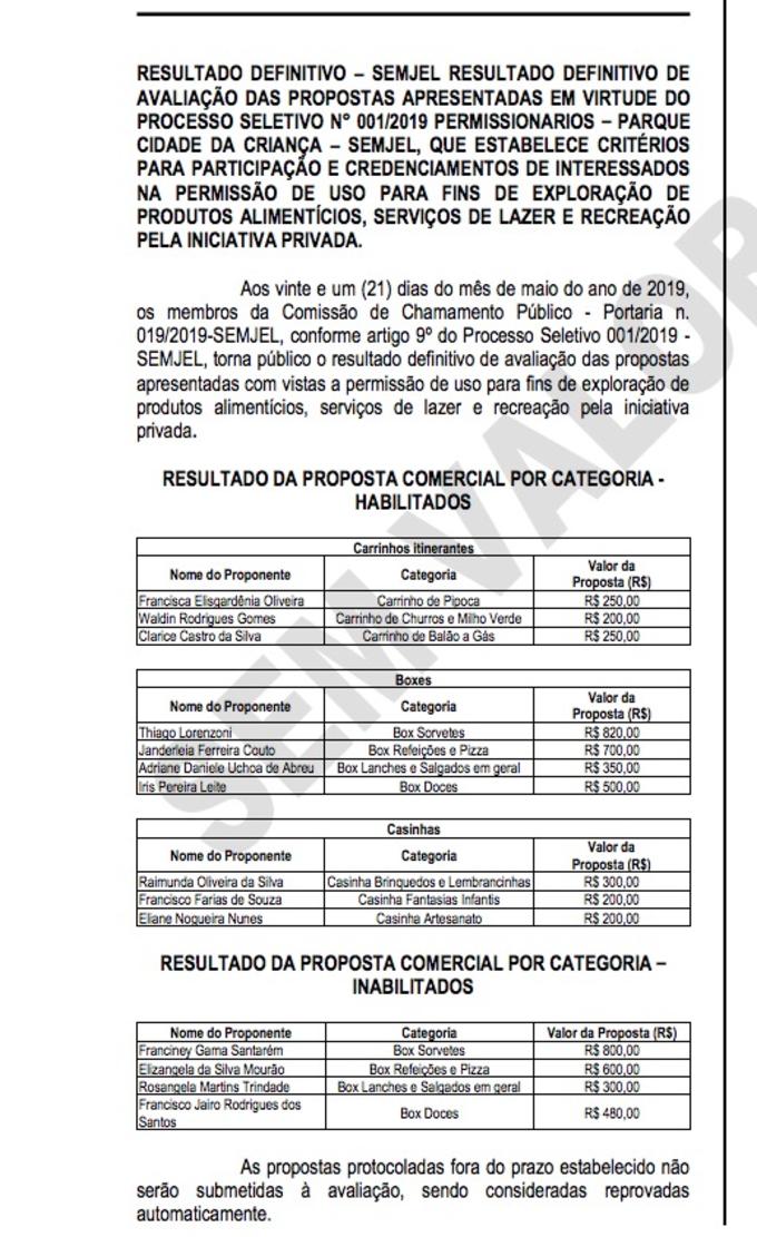 Manaus/AM - A Prefeitura de Manaus divulgou o resultado definitivo do processo seletivo para permissionários no Parque Cidade da Criança, Aleixo, zona Centro-Sul. A publicação da edição 4.685 do Diário Oficial do Município (DOM) apresenta os selecionados que farão uso do espaço para exploração de produtos alimentícios, serviços de lazer e recreação. Veja os selecionados abaixo.
