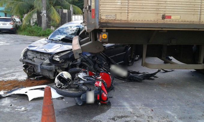 O motorista do C3, Paulo César de Azevedo Júnior, 43, que teve o carro parcialmente destruído ao se chocar contra o para choque da carreta, informou que estava parado atrás da moto esperando a carreta fazer o retorno na via quando foi atingido pelo carro branco.