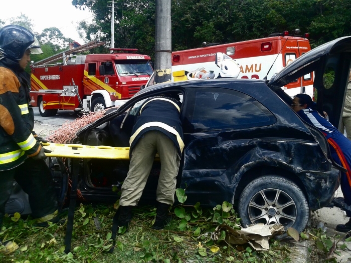Equipes do Corpo de Bombeiros fizeram o resgate das vítimas entre as ferragens, utilizando o desencarcerador, equipamento para cortar aço.