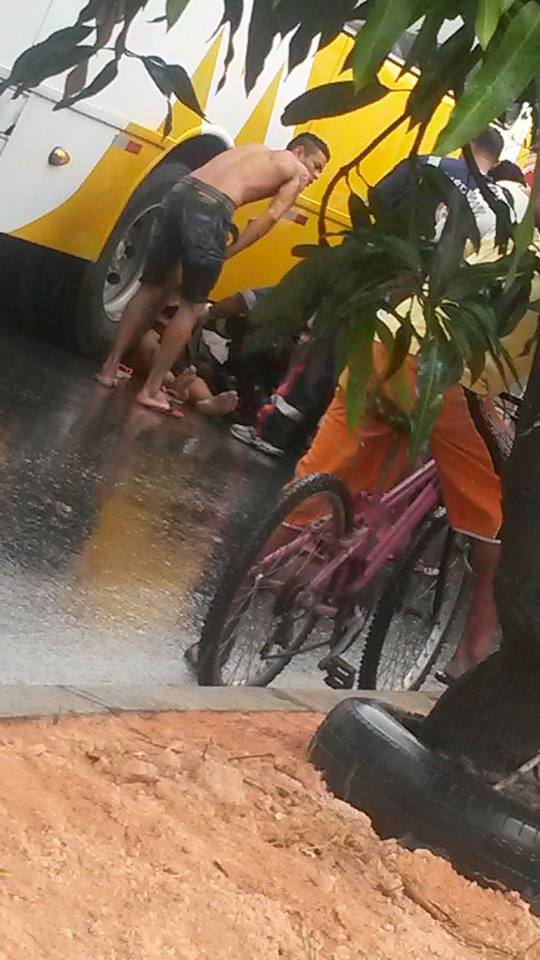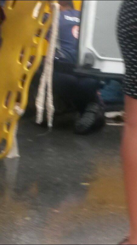 Uma dupla seguia de motocicleta pela via durante a chuva, quando acabou desequilibrando e parando embaixo de um ônibus. Conforme testemunhas o garupa conseguiu sair a tempo. Já o motociclista teve de ser atendido pelo SAMU.