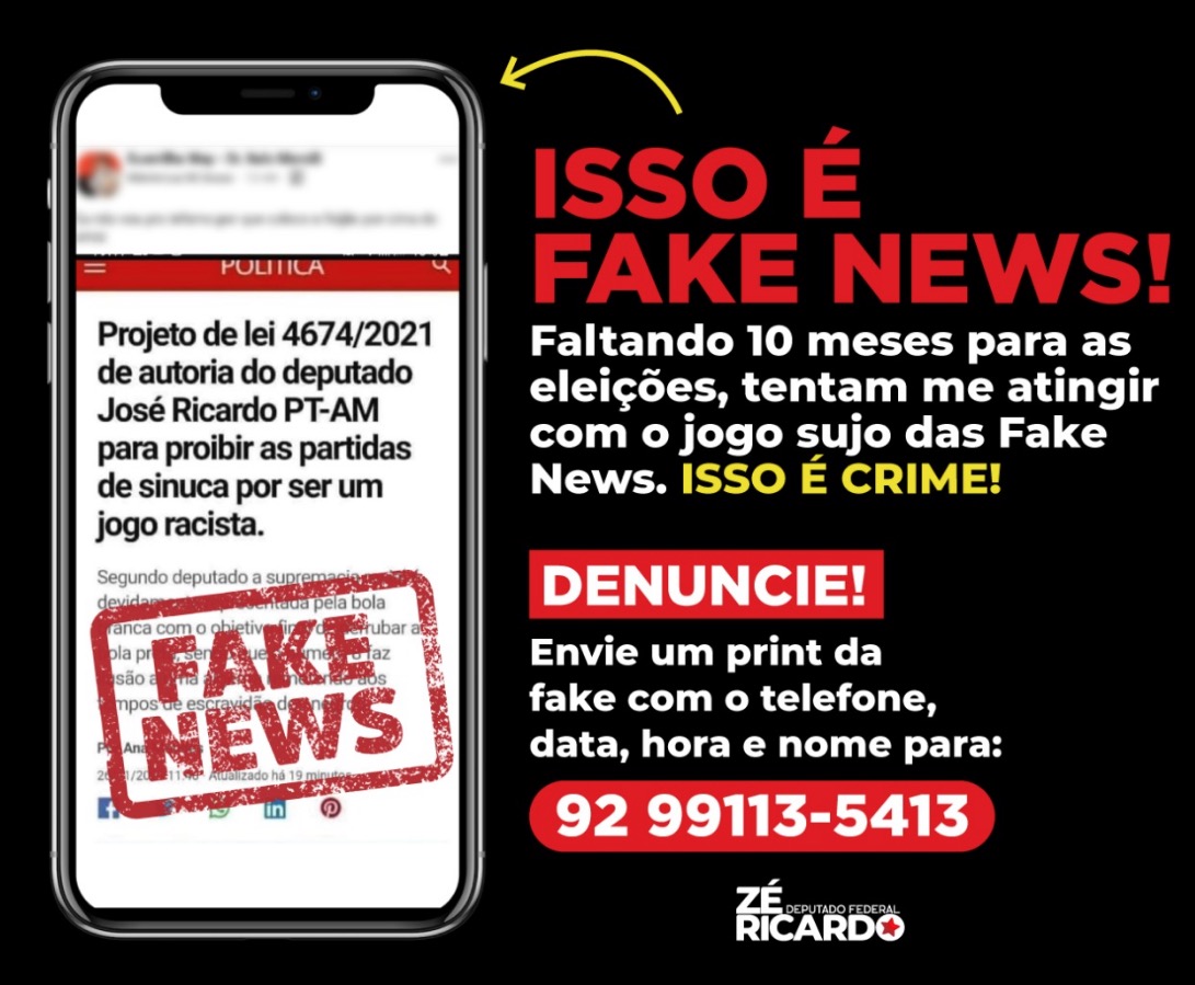 Começou a circular nas redes sociais uma imagem do que seria uma notícia afirmando que o deputado José Ricardo (PT-AM) havia criado um projeto de lei nº 4674/2021 que proibia jogo de sinuca por ser racista. O print viralizou assim como um vídeo em que uma pessoa propaga a informação falsa e critica o deputado.
