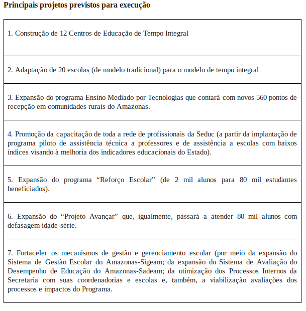 Por meio do Programa de Aceleração do Desenvolvimento da Educação no Amazonas (Padeam), para o prazo de 18 meses, estão previstas ações como: a construção de 12 Centros de Educação de Tempo Integral (Cetis), a adaptação de 20 escolas convencionais para o sistema de educação em tempo integral e a expansão do programa Ensino Mediado por Tecnologias (Centro de Mídias) que contará com novos 560 pontos de recepção em comunidades rurais do Amazonas. Somente com estas ações do segmento de infraestrutura e engenharia, a rede pública estadual de educação terá sua capacidade de atendimento ampliada em 33 mil novas vagas.