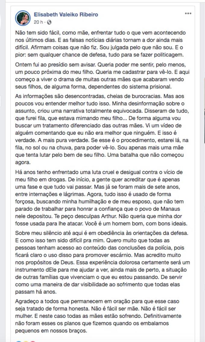 Elizabeth deu detalhes sobre o vício do filho e a forma como ‘falsas notícias diárias’ estão sendo veiculadas como forma de fazer ‘politicagem’ sobre o caso. Ela esclareceu sobre a questão de ‘ter furado fila’ em visita ao Centro de Detenção Provisória (CDPM), onde Alejandro cumpre prisão preventiva. Além disso, a primeira-dama pediu desculpas ao Prefeito Arthur Neto, pelos ataques que ele vem sofrendo por conta do enteado: Te peço desculpas Arthur. Não queria que minha dor fosse usada para lhe atacar. Você é um homem bom, com bons ideais.”
