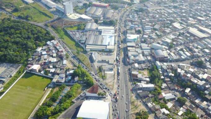 Duas faixas estão interditadas, causando retenção intensa, nas proximidades da bola do Coroado. Os agentes de trânsito recomendam evitar o trecho e utilizar rotas alternativas.