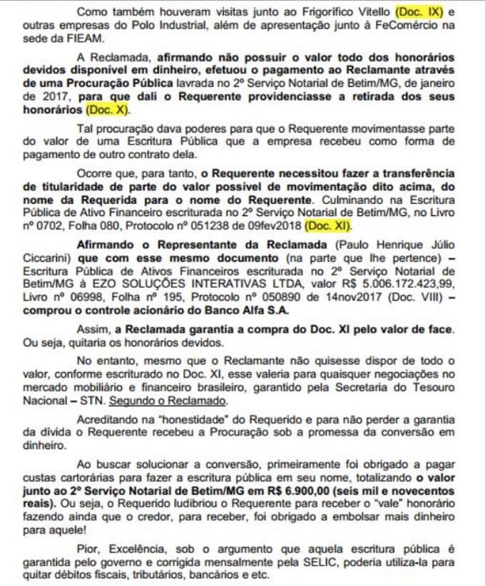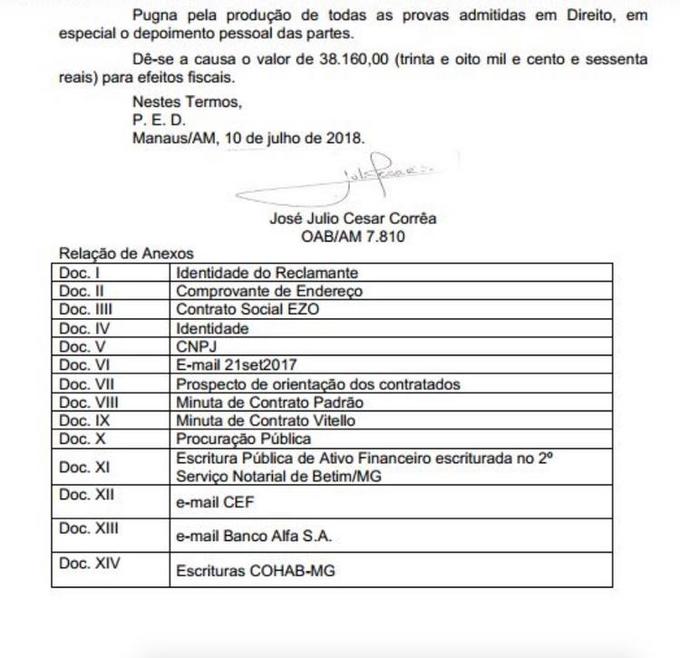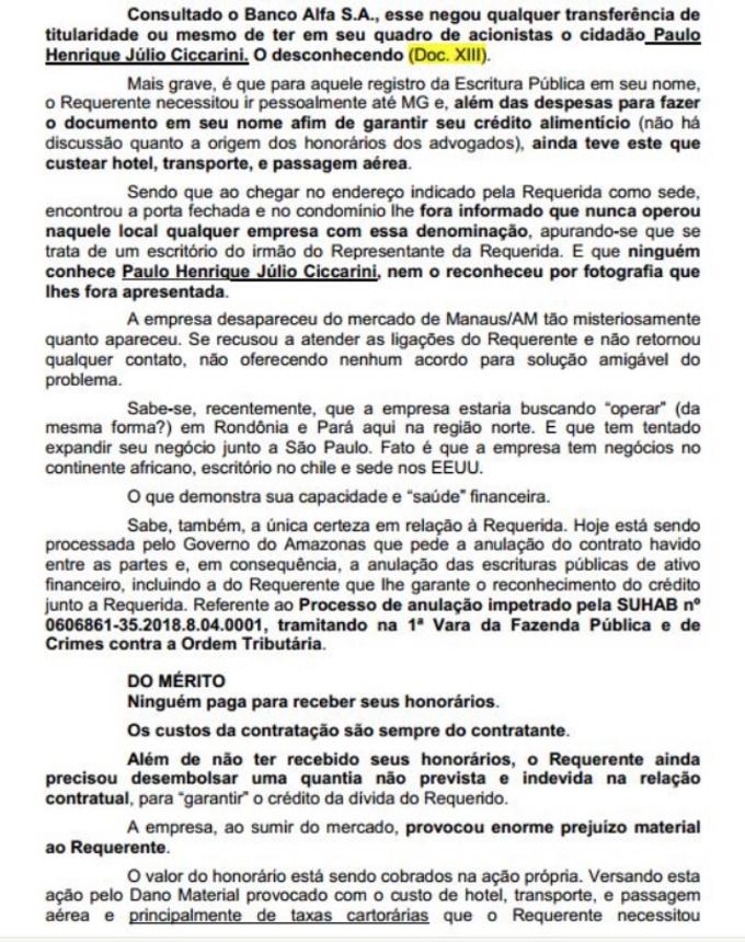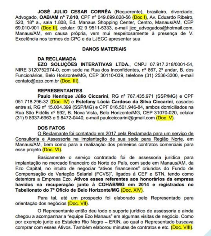 Júlio César, que teria R$ 200 milhões para receber de honorários da Ezo, pelo contrato com o governo do Amazonas, diz na ação movida na Justiça do Amazonas (processo 0617587-26.2018.8.04.0015) que procurou a empresa e que “ao chegar no endereço indicado como sede, encontrou a porta fechada e no condomínio lhe fora informado que nunca operou naquele local qualquer empresa com essa denominação”. Diz, que apurou que no endereço em que deveria estar o escritório da Ezo, estava o escritório do irmão do representante da empresa e que “ninguém conhece Paulo Henrique Júlio Ciccarini, nem reconheceu por fotografia que lhes fora apresentada”.