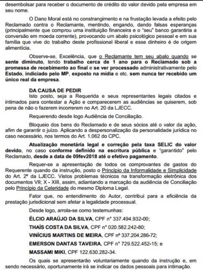 Na ação movida conta a Ezo, o advogado pede R$ 38.160,00 por danos morais e diz que, além de não receber os honorários, precisou desembolsar uma quantia não prevista e indevida na relação contratual, o que lhe provocou prejuízos, como custos de hotel, tansporte e passagem aérea até Minas Gerais, onde estaria a sede da empresa. “A empresa desapareceu do mercado de Manaus (AM) tão misteriosamente quanto apareceu. Se recusou a atender as ligações e não retornou qualquer contato, não oferecendo nenhum acordo para a solução amigável do problema”, afirma José Júlio Cesar Corrêa na ação.
