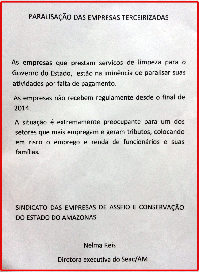 Pela falta de pagamento, o Sindicato das Empresas de Asseio e Conservação do Estado do Amazonas emitiu uma nota alertando sobre a possibilidade da paralisação dos serviços prestados pelas empresas terceirizadas que atualmente prestam serviço para o Governo do Estado do Amazonas.