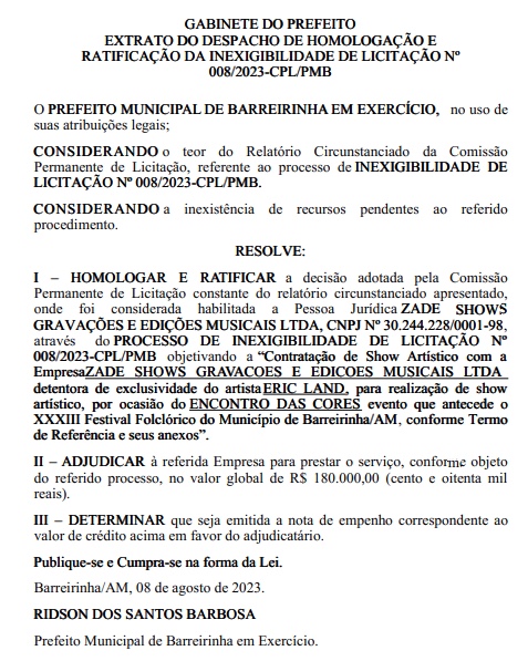O contrato foi firmado por meio de inexigibilidade de licitação, assinado pelo prefeito em exercício Ridson Barbosa.