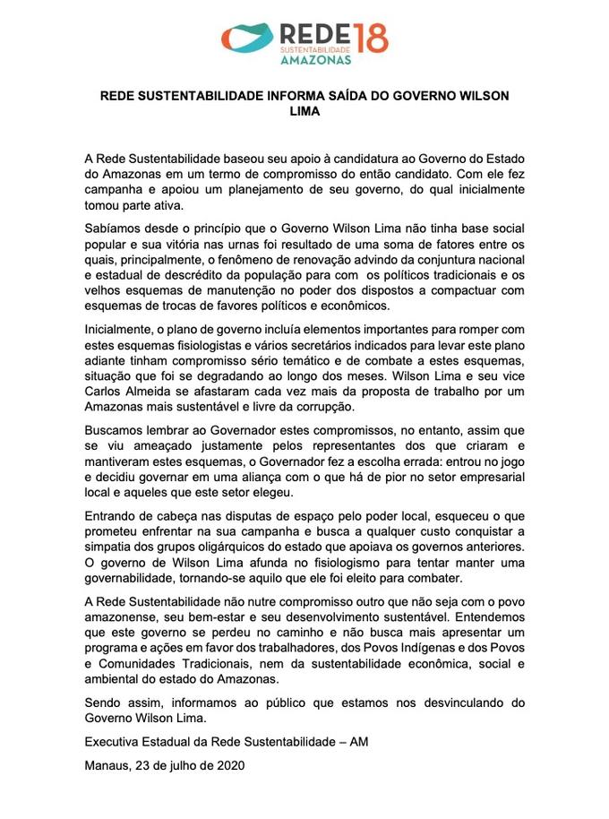 “O governador fez a escolha errada: entrou no jogo e decidiu governar em uma aliança com o que há de pior no setor empresarial local e aqueles que este setor elegeu. Entrando de cabeça nas disputas de espaço pelo poder local, esqueceu o que prometeu enfrentar na sua campanha e busca a qualquer custo conquistar a simpatia dos grupos oligárquicos do estado que apoiava os governos anteriores. O governo de Wilson Lima afunda no fisiologismo para tentar manter uma governabilidade, tornando-se aquilo que ele foi eleito para combater”, trecho do comunicado da Rede.