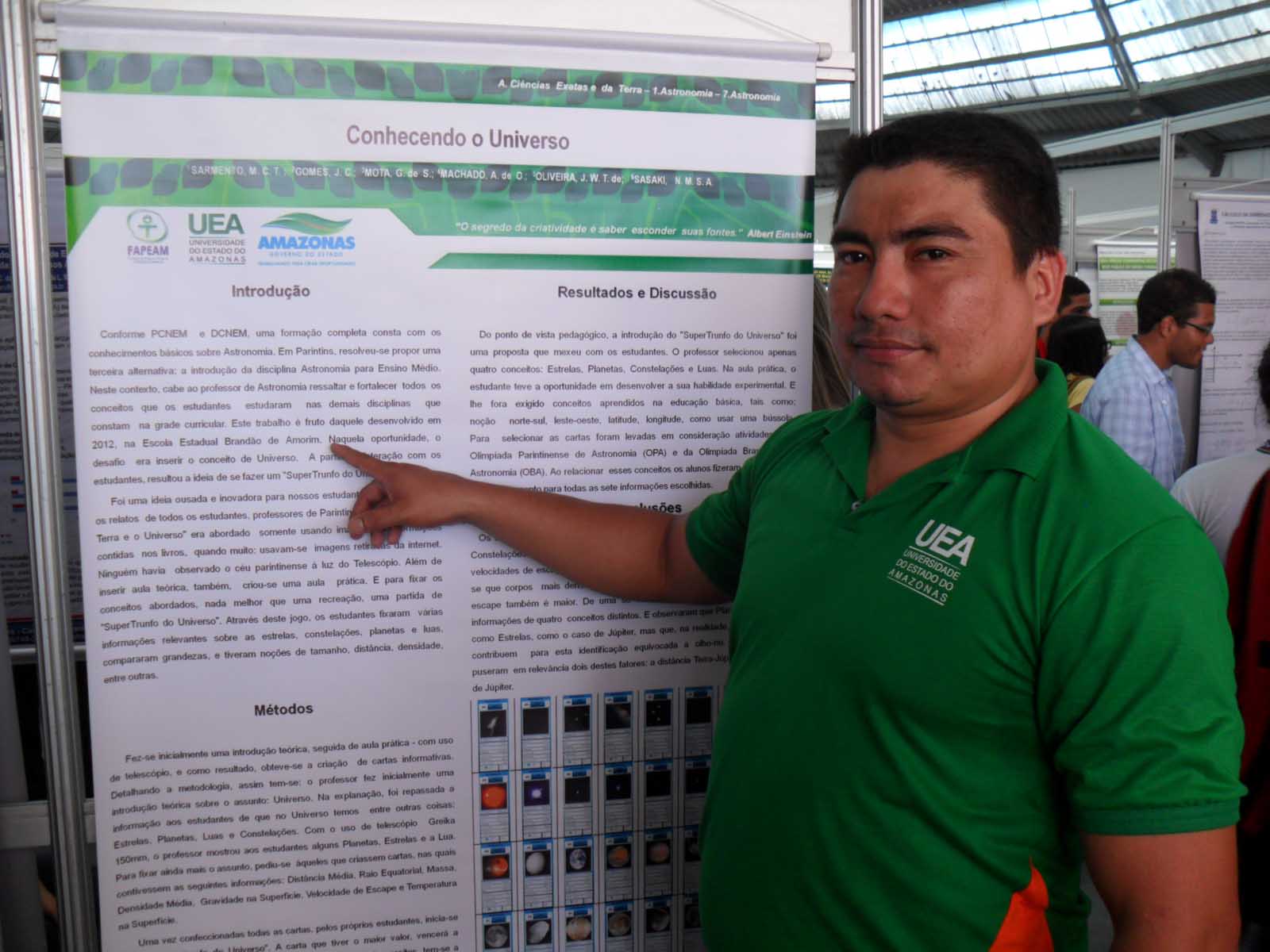 Já o acadêmico Mateus Sarmento apresentou o projeto "Conhecendo o Universo" desenvolvido com alunos do Ensino Médio na Escola Estadual Brandão de Amorim, em Parintins. “Fizemos introdução teórica seguida de aula prática com uso de telescópio e, como resultado, tivemos a criação de cartas informativas explorando os conceitos estudados”, explica Sarmento.