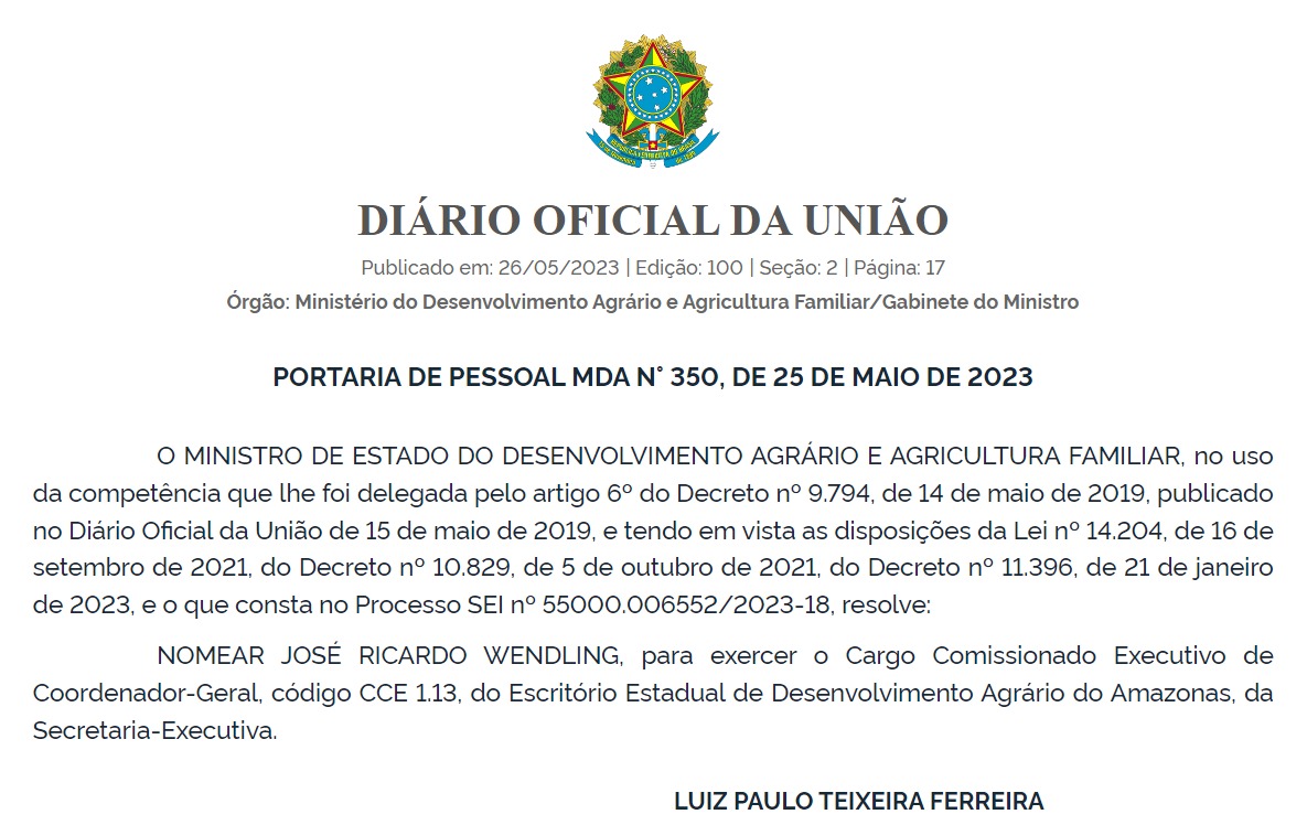 Manaus/AM - O ex-deputado federal José Ricardo (PT) foi nomeado para cargo comissionado no governo Lula. Ele será coordenador-geral do Escritório Estadual de Desenvolvimento Agrário do Amazonas. A nomeação foi publicada no Diário Oficial da União desta sexta-feira (26), assinada pelo ministro do Desenvolvimento Agrário e Agricultura Familiar, Luiz Paulo Ferreira.