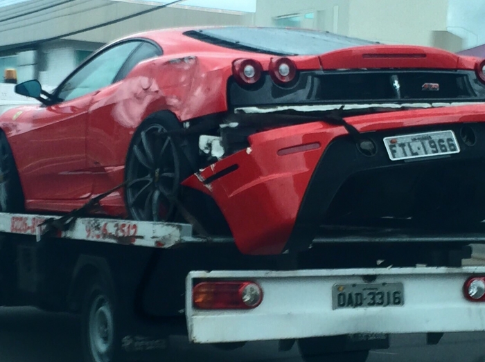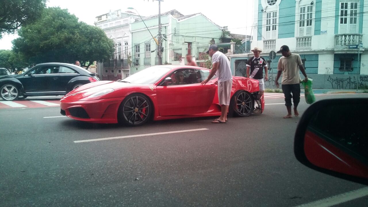 Uma Ferrari, cor vermelha, placa FTL-1966, dirigida por um homem até o momento identificado pelo nome de Aldrin, bateu na tarde deste domingo contra uma árvore na Rua Ferreira Pena. A informação é de que o motorista, que "namorava" enquanto dirigia, acelerou demais a sua Ferrari, avançou o sinal e bateu. O carro sofreu avarias na parte traseira e foi transportado por uma plataforma.