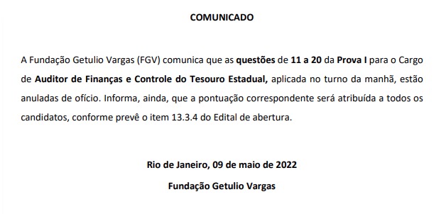 Manaus/AM - A Fundação Getúlio Vargas, responsável pelo concurso da Secretaria de Fazenda do Amazonas (Sefaz), que ocorreu neste fim de semana, publicou nesta segunda-feira (9), que 10 questões da prova objetiva para o cargo de Auditor de Finanças e Controle do Tesouro Estadual, foram anuladas.