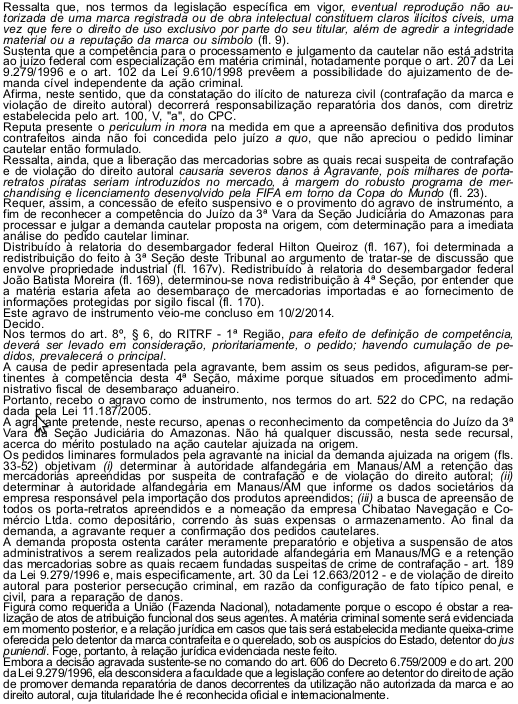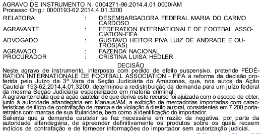 A desembargadora federal Maria do Carmo Cardoso, decidiu acolher agravo interposto pela Fifa e determinou que cabe a 3a Vara Judiciária no Amazonas o julgamento da ação cautelar movida contra a Fazenda Nacional que se negou revelar nome de um empresário de Manaus que importou 7.200 porta-retratos com marcas de sua titularidade. A Fifa viu nessa importação " um ilícito de contratação de marca e violação de direito autoral.