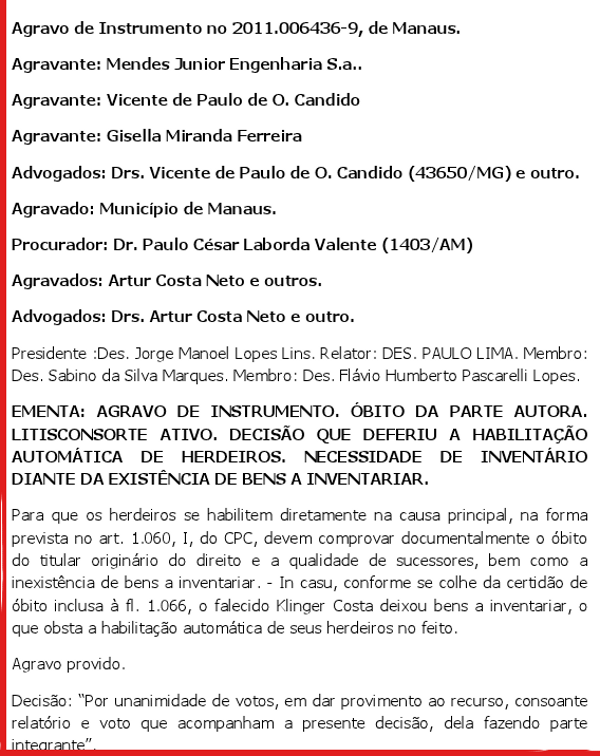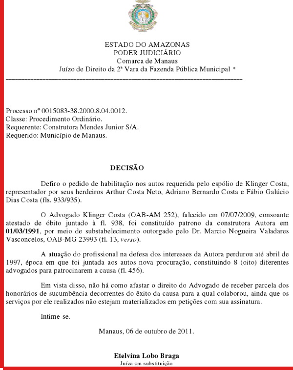 Os desembargadores da Primeira Câmara Cível do Tribunal de Justiça do Amazonas acompanharam o voto do relator, Paulo César Caminha e Lima, e deram provimento ao agravo de instrumento interposto pela construtora para reformar a decisão da juíza Etelvina Lobo Braga, da 2ª Vara da Fazenda Pública Municipal, que concedeu liminar aos herdeiros de Klinger Costa, autorizados por ela a receber as parcelas dos honorários.