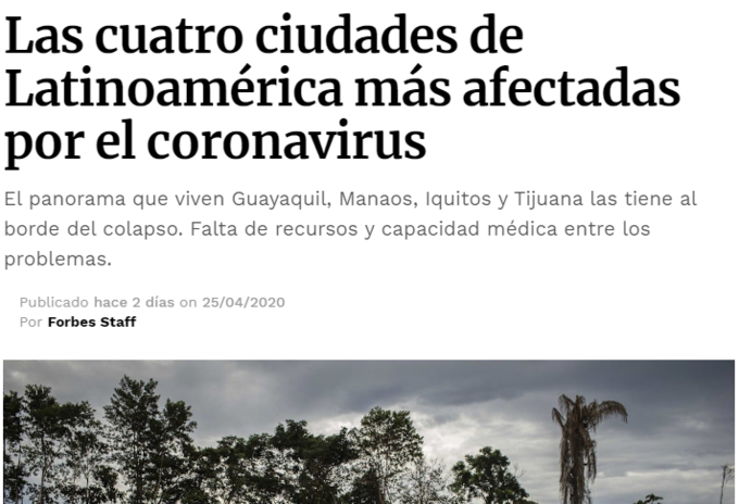 Guayaquil é a cidade com a situação mais grave, com corpos sendo deixados nas ruas, necrotérios lotados e cemitérios em colapso. Em Manaus, a revista cita que o colapso se inicia nos hospitais lotados e segue com os corpos sendo enterrados em valas comuns no maior cemitério da cidade.