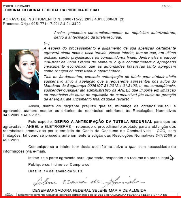 A antecipação da tutela em agravo de instrumento foi concedida no último dia 14 pela desembargadora Selene Maria de Almeida, do Tribunal Regional Federal da Primeira Região, que derrubou a decisão do juiz Teles Krauss Queiroz, substituto da 4ª Vara, no exercício da titularidade da 3ª Vara da Seção Judiciária do Distrito Federal, de Brasília, que em dezembro indeferiu o pedido da usina termoelétrica.