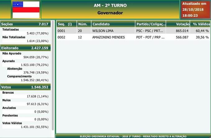 Governador do Amazonas: parcial com mais de 81% das urnas apuradas