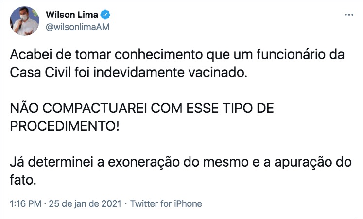 “Acabei de tomar conhecimento que um funcionário da Casa Civil foi indevidamente vacinado. NÃO COMPACTUAREI COM ESSE TIPO DE PROCEDIMENTO! Já determinei a exoneração do mesmo e a apuração do fato", informou Lima.