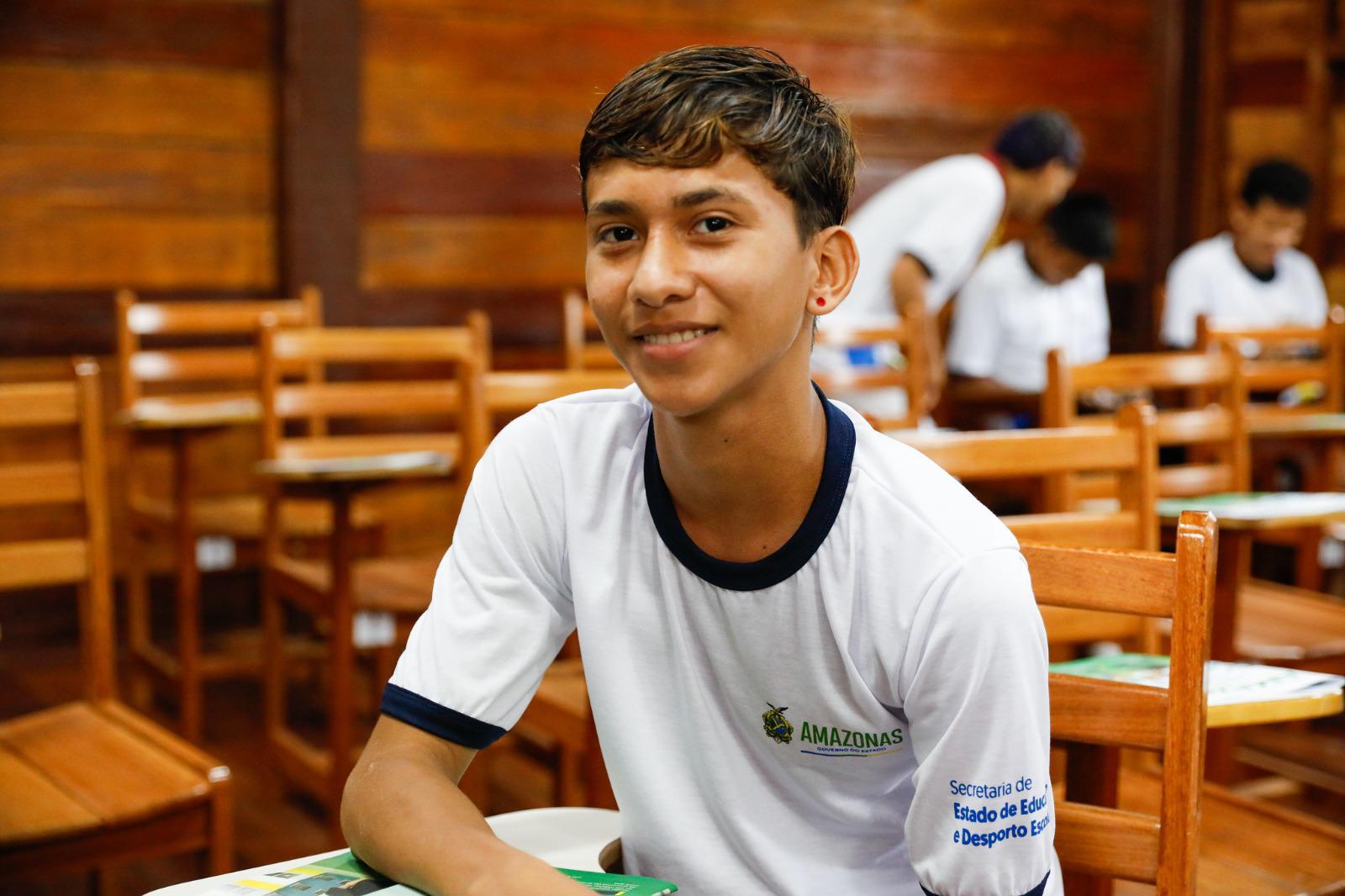 O estudante Saimom Afonso, de 15 anos, morador da comunidade Nossa Senhora de Fátima, vê na Escola da Floresta uma oportunidade de mudar sua vida. Ele estava impressionado com a escola e espera melhorar nos estudos.