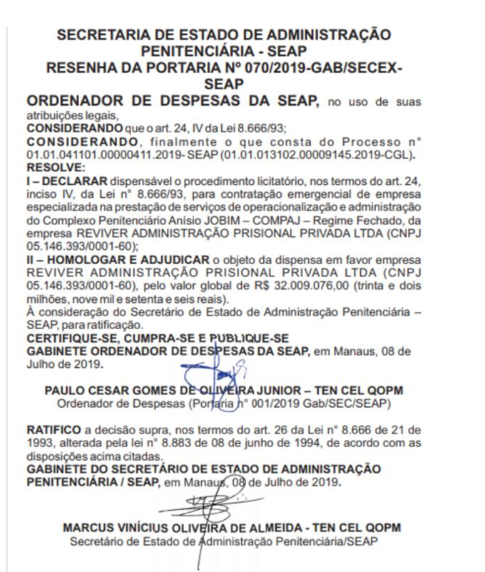 A Reviver Administração Prisional, que está administrando Complexo Penitenciário Anísio Jobim, foi contratada por R$ 32 milhões.