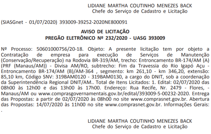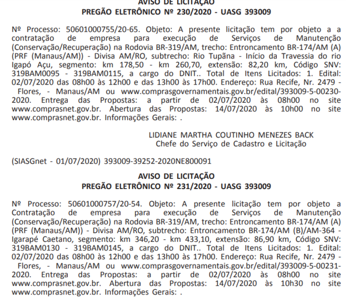 Os avisos de licitação com os números 230, 231 e 232 foram publicados no Diário Oficial da União pelo Departamento Nacional de Infraestrutura e Transportes (Dnit). São três pregões eletrônicos que já estão recebendo propostas desde a última quinta-feira (2). A abertura das propostas deve ser realizada no próximo dia 14 deste mês.