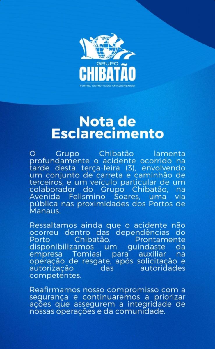 "O Grupo Chibatão lamenta profundamente o acidente ocorrido na tarde desta terça-feira (3), envolvendo um conjunto de carreta e caminhão de terceiros, e um veículo particular de um colaborador do Grupo Chibatão, na Avenida Felismino Soares, uma via pública nas proximidades dos Portos de Manaus", diz a nota.