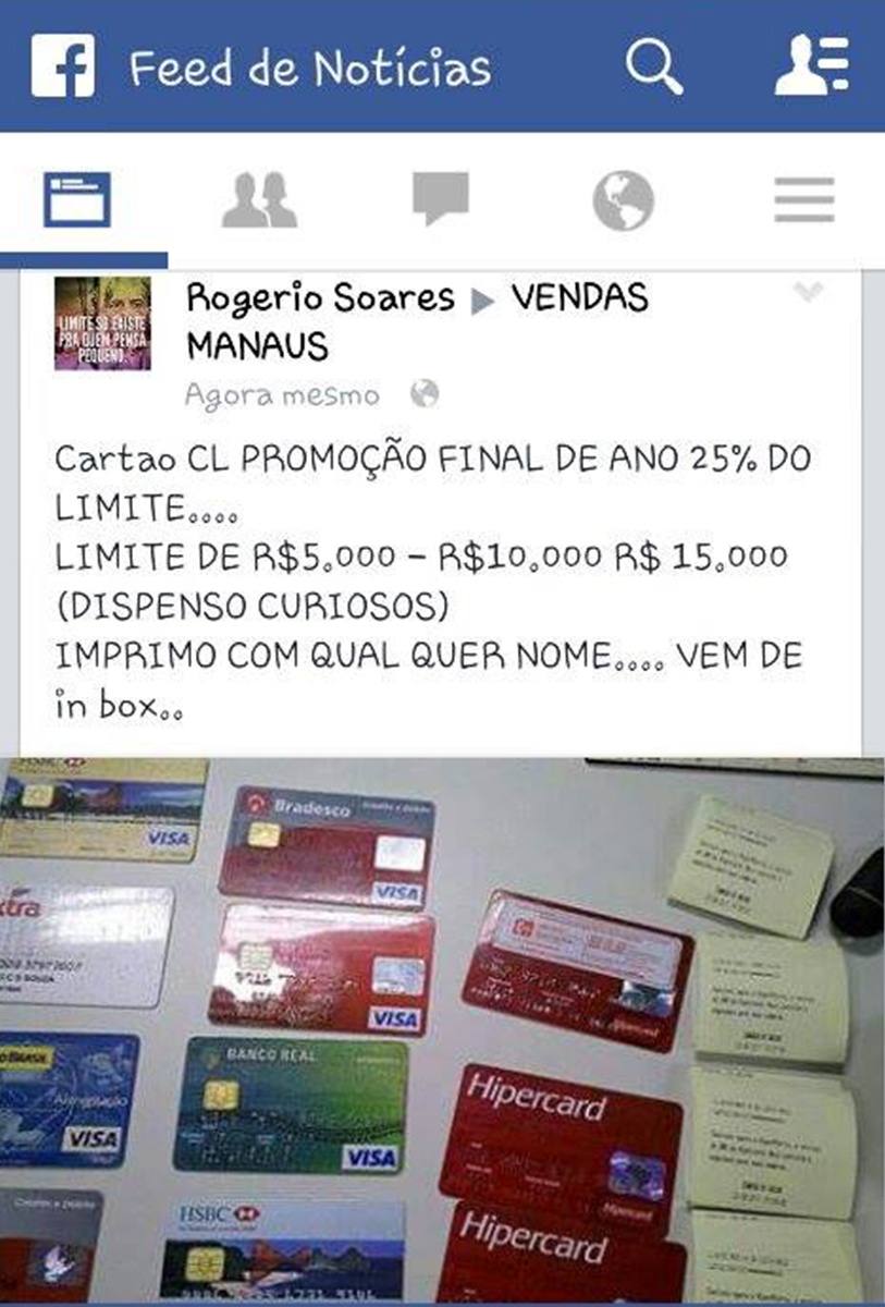 Leitor denuncia ao portal a venda descarada de cartões de crédito com créditos que supostamente chegariam a limites como 5 mil, 10 mil e 15 mil reais. Até agora as informações são minimas sobre o golpe de cartões clonados. no entanto, o portal no intuito de alertar e proteger seus leitores trouxe o caso a tona mesmo com limitações sobre o suposto golpe.
