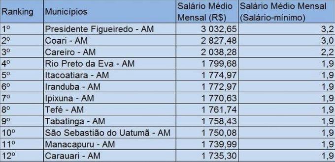 Completando a lista dos cinco primeiros está o Careiro com R$ 2.038,28 da média mensal salarial, seguido de Rio Preto da Eva com média de R$ 1.799,68. Esses dados são referentes ao Cadastro Central de Empresas do ano de 2017.