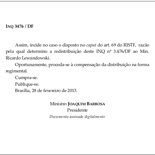Mas o presidente do STF, ministro Joaquim Barbosa, não acatou o despacho de Mendes, e sim o parecer do procurador geral da República, Roberto Gurgel, e por prevenção determinou que os autos fossem redistribuídos a Ricardo Lewandowski, que é relator de um inquérito que investiga o homem forte do PR, Valdemar Costa Neto e o senador Alfredo Nascimento, e deverá dar a palavra final do desmembramento dos autos.