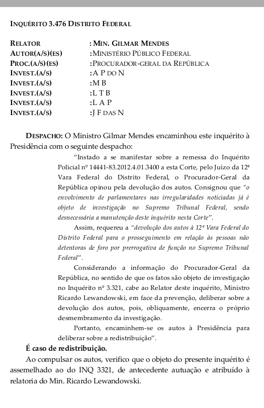 De acordo com despacho do ministro, pessoas não detentoras de foro por prerrogativa de função voltarão a ser investigadas pela juíza Pollyanna Kelly Maciel Medeiros Martins Alves, da 12ª Vara Federal do Distrito Federal.