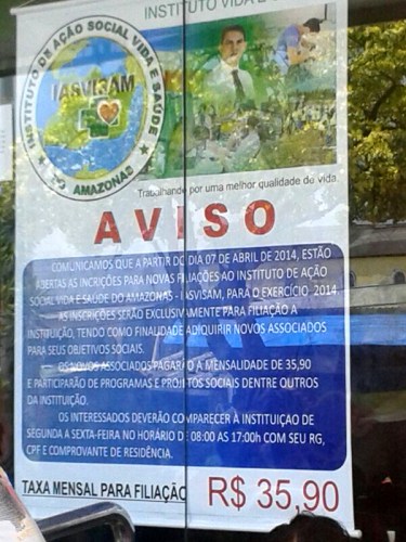 As inscrições feitas pelo Iasvisam são “exclusivamente para filiação a instituição, tendo como finalidade adquirir novos associados para seus objetivos sociais”. A advertência está em um cartaz na frente da sede da instituição, na avenida Itaúba, Jorge Teixeira, onde, desde segunda-feira, dia 7, o Iasvisam abriu inscrições ao preço de R$ 35,90, mesmo valor de mensalidade, e tem arrastado multidões para seus quadros.