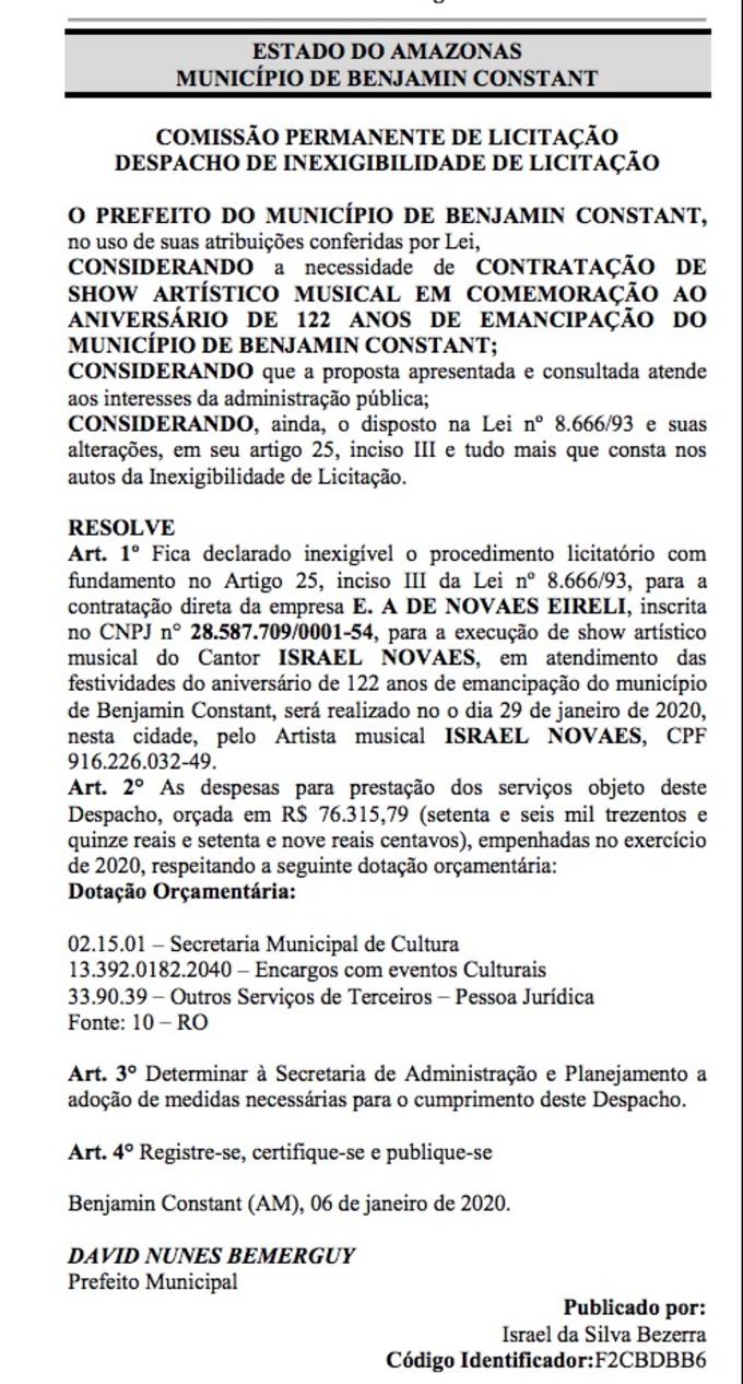 Manaus/AM - O cantor Israel Novaes será atração da Festa de Aniversário de 122 anos da Emancipação do Município de Benjamin Constant, no próximo dia 29 de janeiro. O contrato com o cantor foi assinado pelo prefeito David Nunes Bemerguy, no valor de R$ 76.315,79.