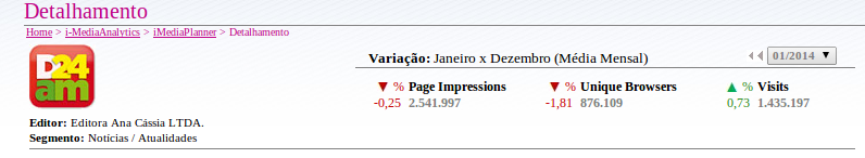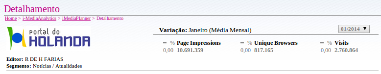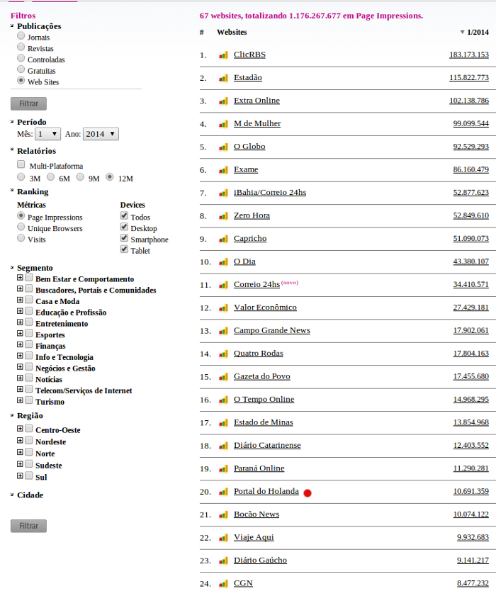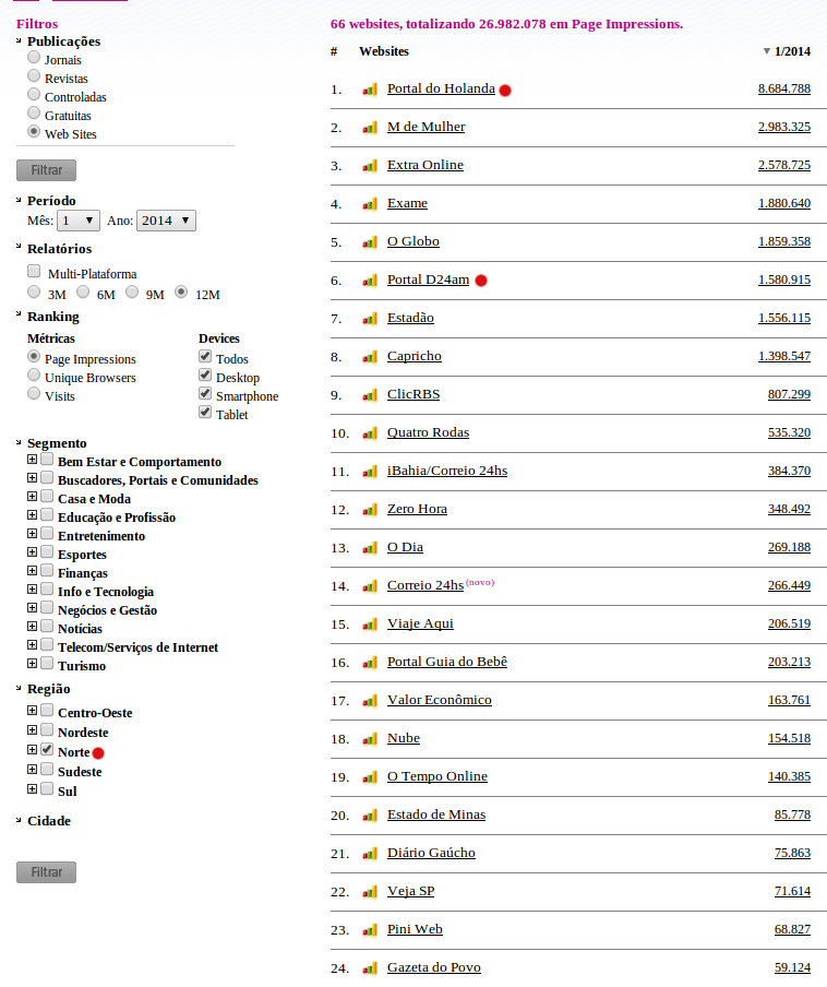 Dos 63 sites auditados pelo IVC, o Portal do Holanda aparece em janeiro com 817.165 visitantes únicos e 10.691.359 pageviews (ou páginas abertas) por esses mesmos leitores. O D24am, do Grupo Ana Cássia, teve mais visitantes unicos: 876.109, mas os leitores ficaram menos tempo no site e se interessaram muito pouco pelo conteúdo do portal: abriram apenas 2,5 milhões de páginas, contra 10,7 milhões no Portal do Holanda. Veja o número de pagínas abertas pelos leitores nos principais sites auditados pelo IVC.