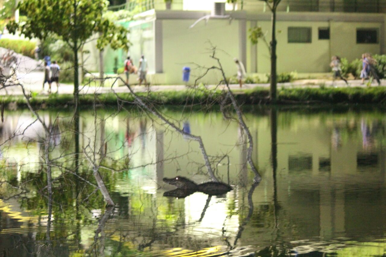 Manaus/AM - Na noite desta segunda-feira (4), um jacaré foi flagrado a espreita na Lagoa do Japiim localizada na Avenida General Rodrigo Otávio, bairro Japiim, zona Sul de Manaus.