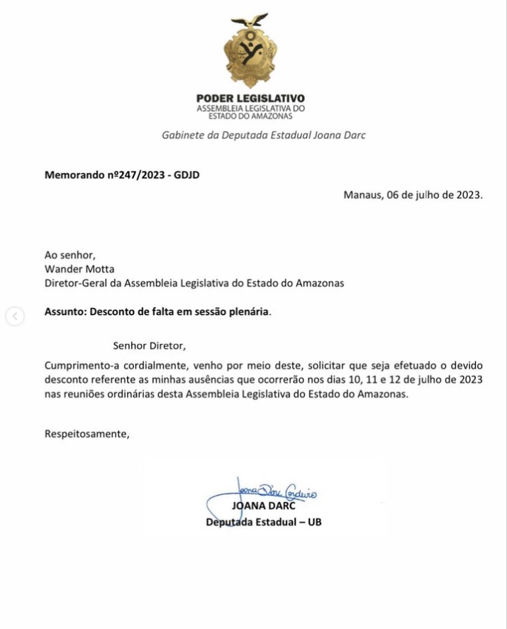 Manaus/AM - A deputada Joana Darc (União) se manifestou nas redes sociais, nesta quarta-feira (12) após ter sido flagrada em show de Wesley Safadão nas Bahamas, enquanto deveria estar participando de sessão na Assembleia Legislativa do Amazonas (Aleam). A parlamentar explicou que tirou férias de sete dias e que pediu para que houvesse desconto do seu salário.
