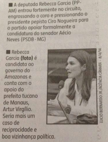 O jornal O Estado de Minas dá como o certo o apoio do presidenciável Aécio Neves ( PSDB) à candidatura da deputada Rebecca Garcia(PP) no Amazonas. O Jornal, em sua coluna política deste domingo, cita o esforço que a deputada vem fazendo para trazer o PP para a base do tucano.