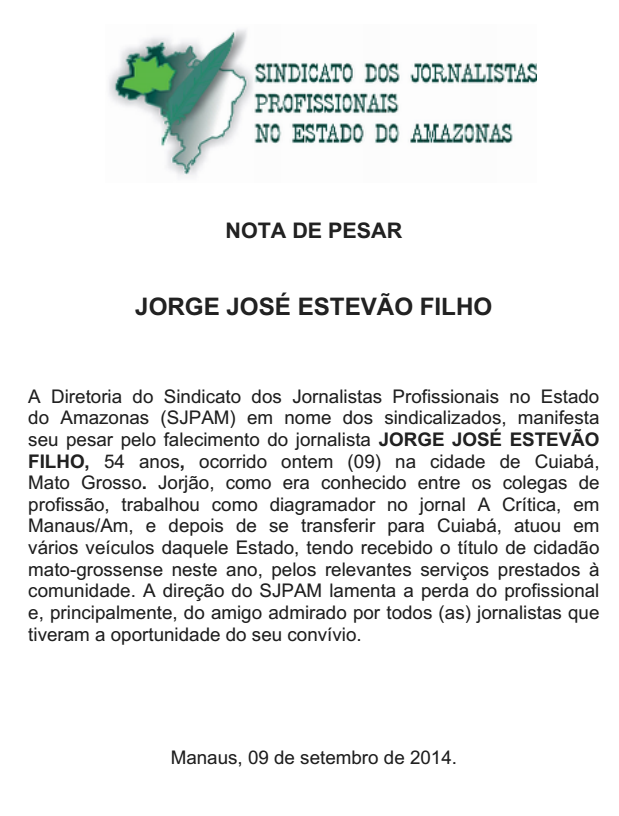 O jornalista amazonense José Estevão Filho, morreu em Cuiabá Mato Grosso. Ele trabalhou em vários veiculos de comunicação de Manaus. Em Nota, o Sindicato dos Jornalistas Profissionais do Amazonas lamenta a morte de Estevão.
