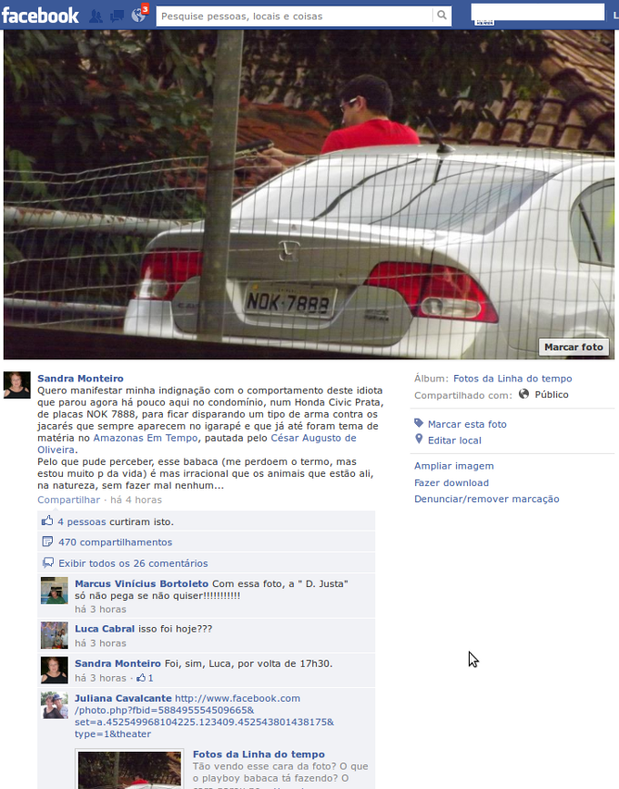 A jornalista Sandra Monteiro fotografou um homem, ainda não identificado atirando em jacarés no igarapé que corta a Avenida Constantino Nery, em Manaus, A foto, onde aparece o carro Honda Civic, de placa NOK 7888, supostamente de propriedade do atirador, foi postada na página da jornalista no Facebook.
