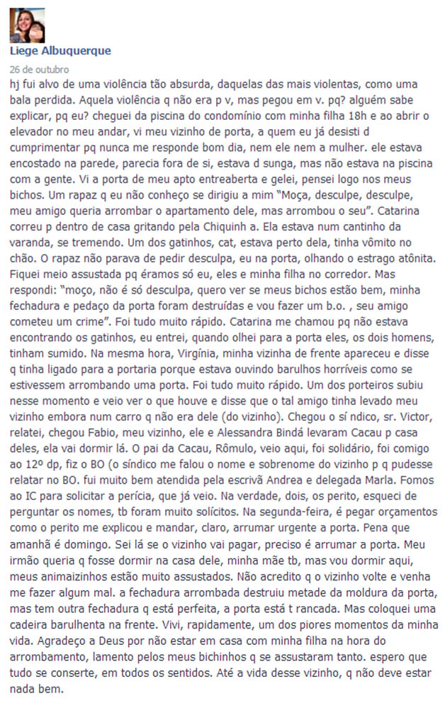 A jornalista Liege Albuquerque teve seu apartamento arrombado por um vizinho e fez um desabafo no Facebook.