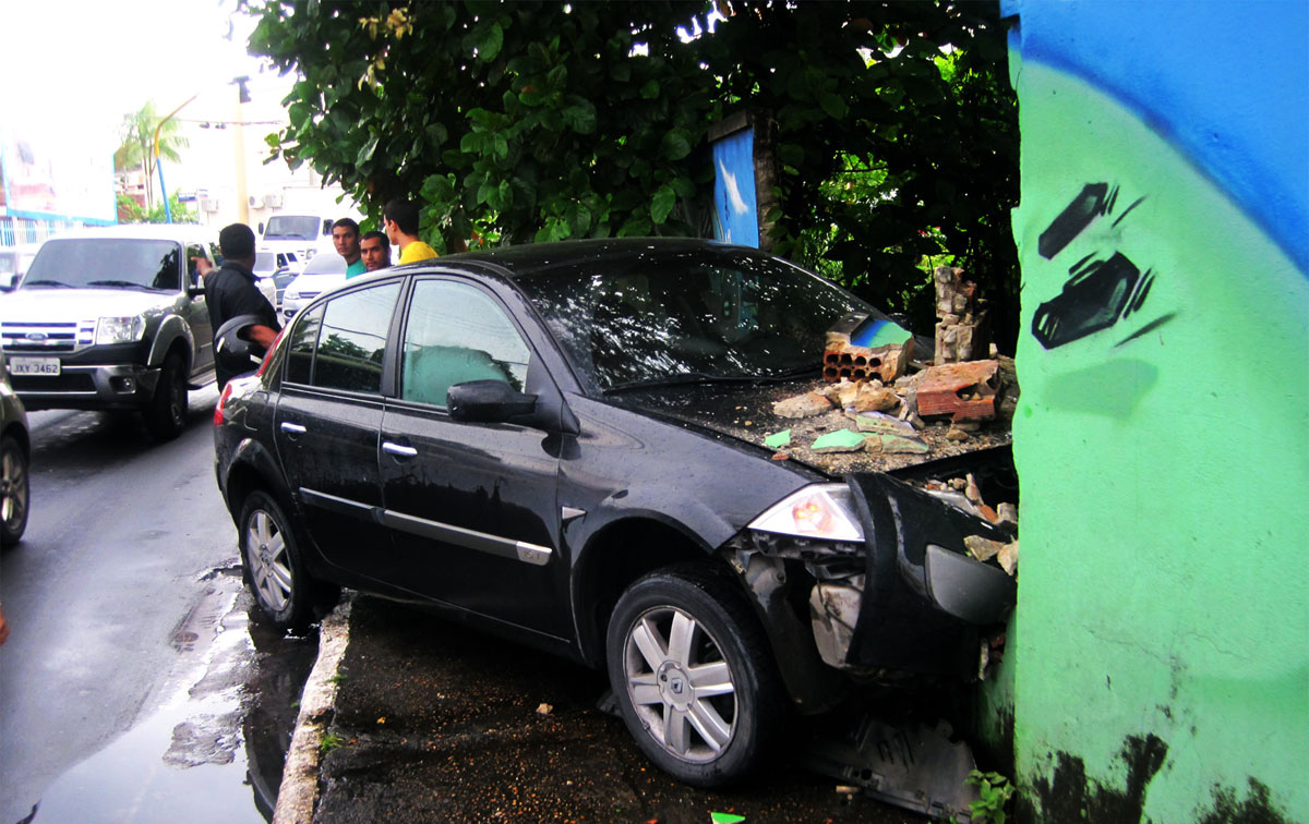Parte do muro foi ao chão. A frente do carro de luxo, visivelmente novo, bastante danificada. O jovem motorista, que tentou uma ultrapassagem sem a menor condição de ser realizada, bastante abatido, como se estivesse envergonhado da imprudência cometida no trânsito.